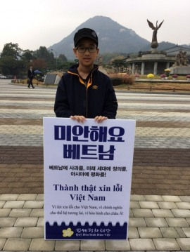 Kim Ji-ho holds a board reading "I am sorry, Vietnam. Apology to Vietnam, Justice to the future generation, Peace to Asia! (Ock Hyun-ju/The Korea Herald)
